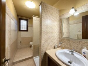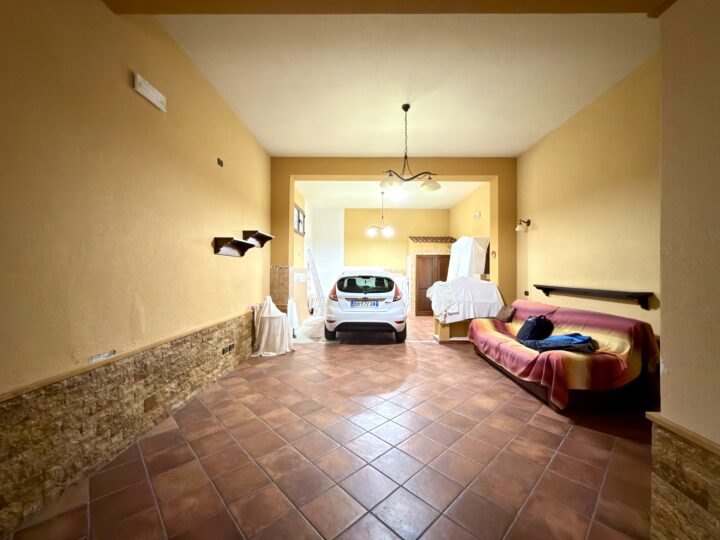 Al piano terra troviamo invece un comodo e rifinito magazzino di mq. 71 composto da un unico ambiente, con accesso carrabile ove possibile parcheggiare almeno 2 auto, oltre bagno con doccia.