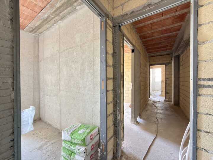 In zona di forte espansione residenziale, l'appartamento di mq. 100 posto al piano primo in contesto condominiale di recentissima costruzione ed ancora in fase di completamento è composto internamente da ingresso su cucina/soggiorno con accesso alla veranda coperta esclusiva, disimpegno che conduce ai 2 bagni, ripostiglio/lavanderia e 2 camere da letto.
