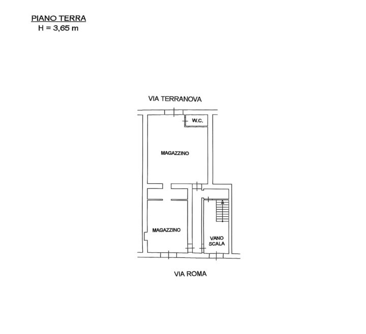 Compresi nel prezzo di vendita al piano terra due magazzini comunicanti fra loro per un totale di mq. 105 con accesso dall'esterno sia da Via Roma che da Via Terranova, oltre un doppio ingresso da vano scala, magazzini che all'occorrenza possono essere suddivisi e resi indipendenti facilmente.